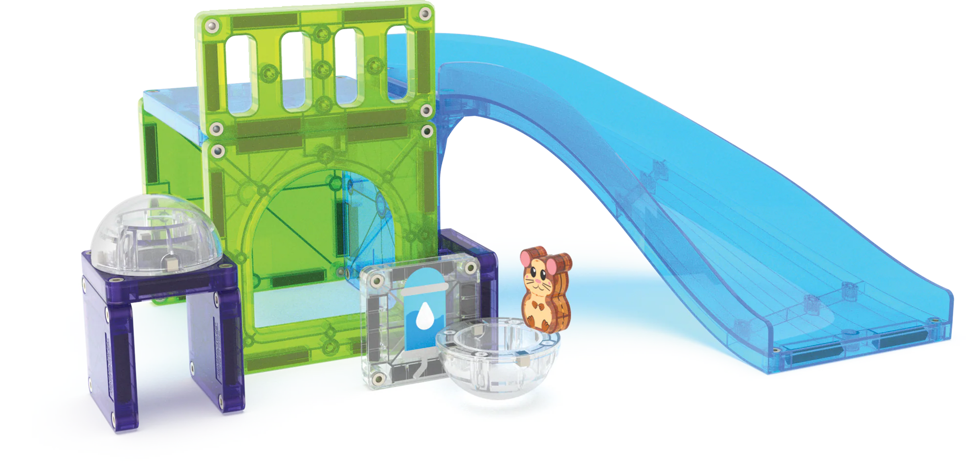 Get ready for a rolling good time with the MAGNA-TILES Hamster Ball Set —the perfect gift for animal lovers and builders alike! This set brings motion and creativity to life with the all-new Slide attachment. Place the adorable hamster in its magnetic ball and watch it roll down around twists and turns. Enhance the fun with microMAGS decorations, inspiring imaginative designs and creative play.