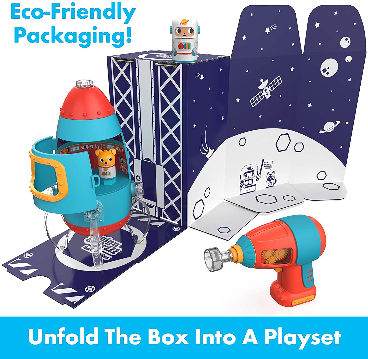 Kids use a real, working, kid-safe drill to build the Rocket, then drop the Bolt Buddy astronaut and his puppy pal into the cockpit and blast off into hours of pretend play fun! Imagination meets construction play!