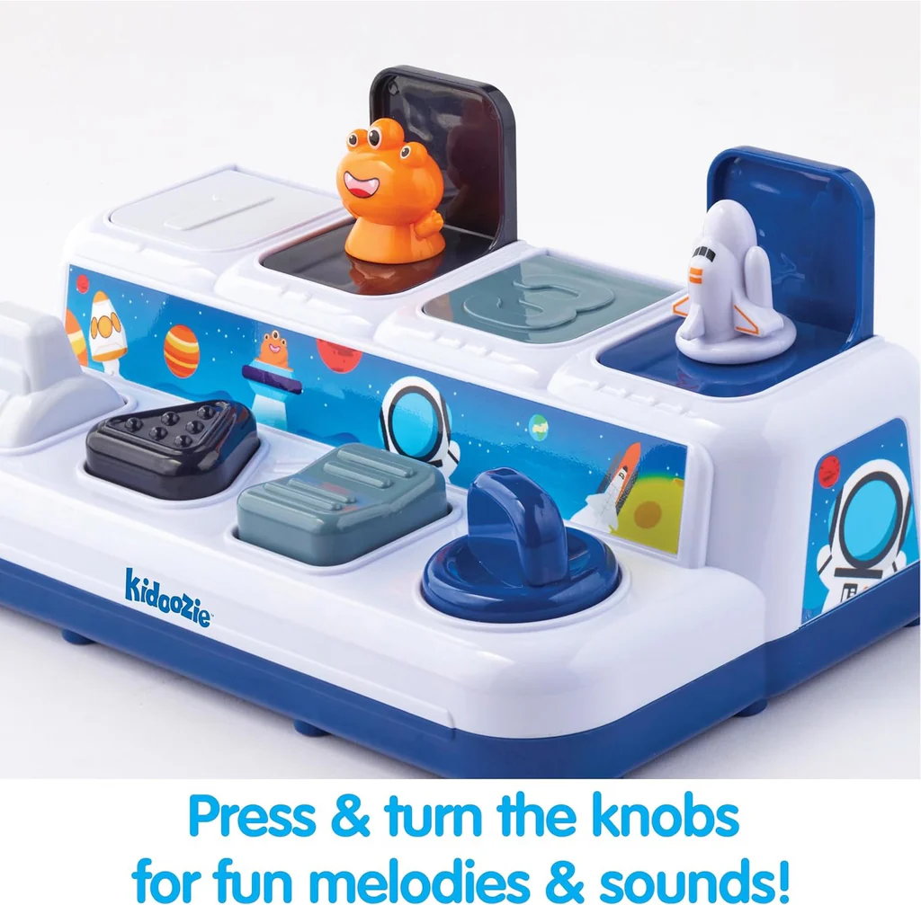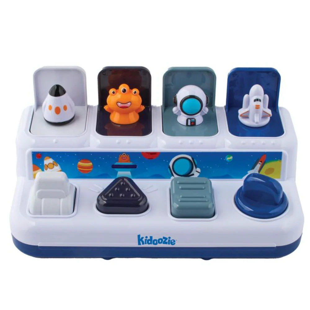 The Kidoozie Pop 'n Play Space Explorer is an engaging and educational toy that promotes hand eye coordination and sensory recognition. It helps your child as they grow from infants into active toddlers. Push, pull or turn the knobs to reveal the space elements along with related sounds & melodies.