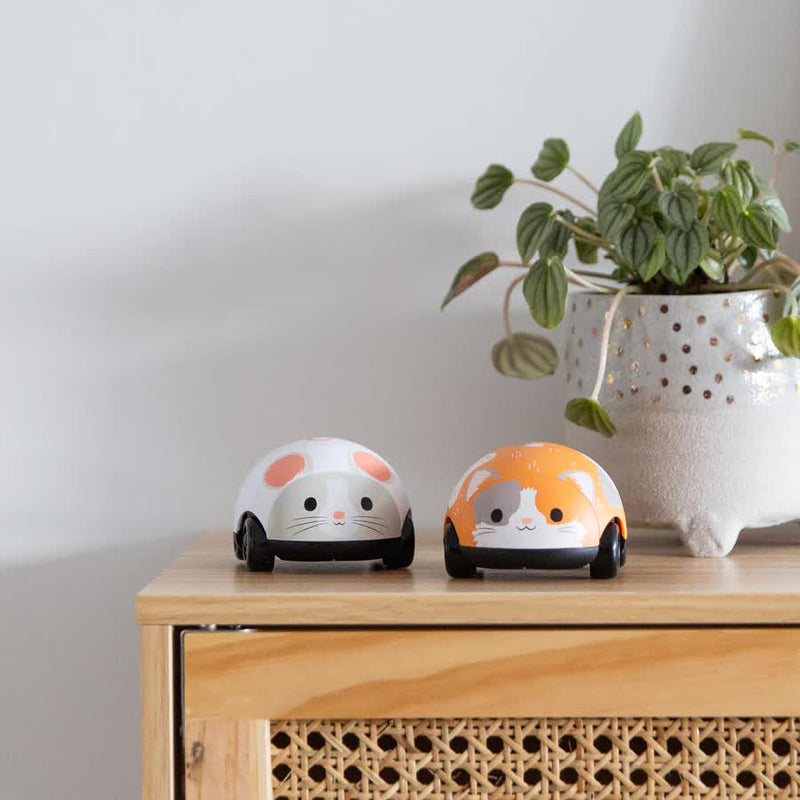 A game of cat and mouse awaits with these engaging pull-back toys! The perfect size for little hands, these battery-free zoomers race back and forth across the floor with one pull back action.